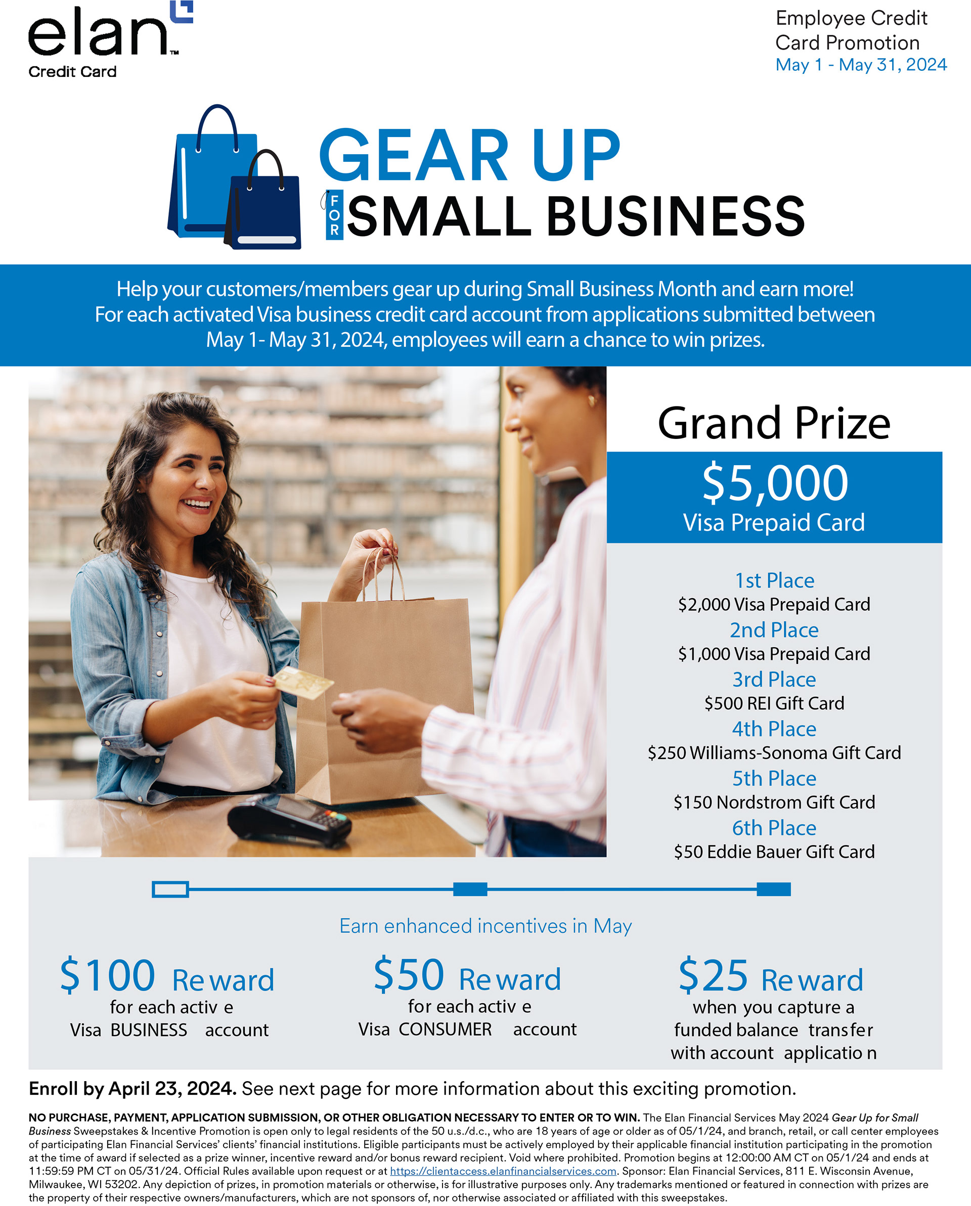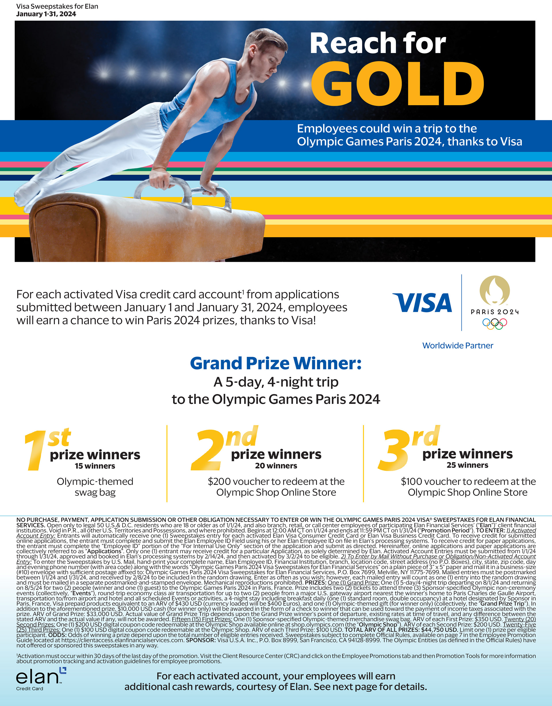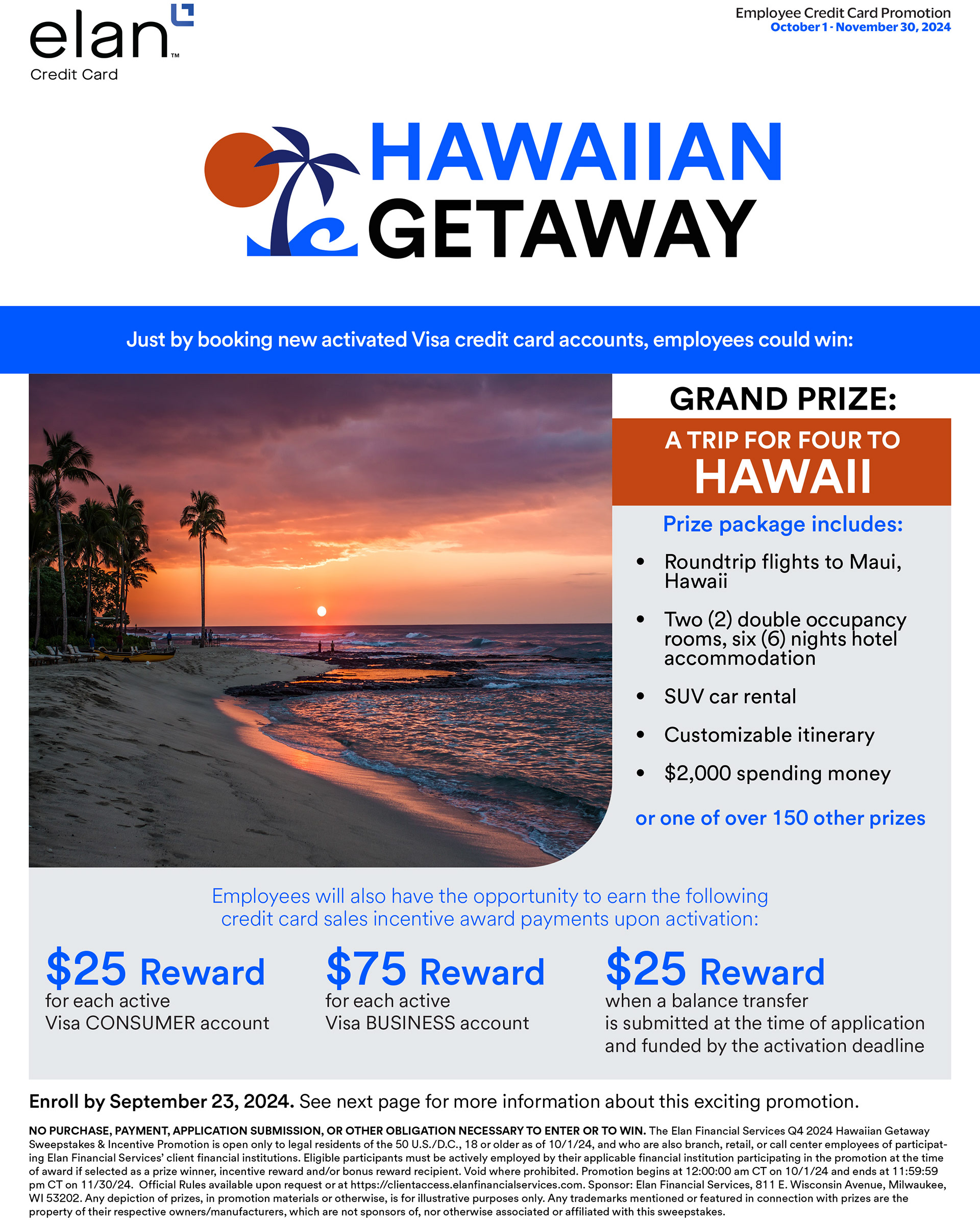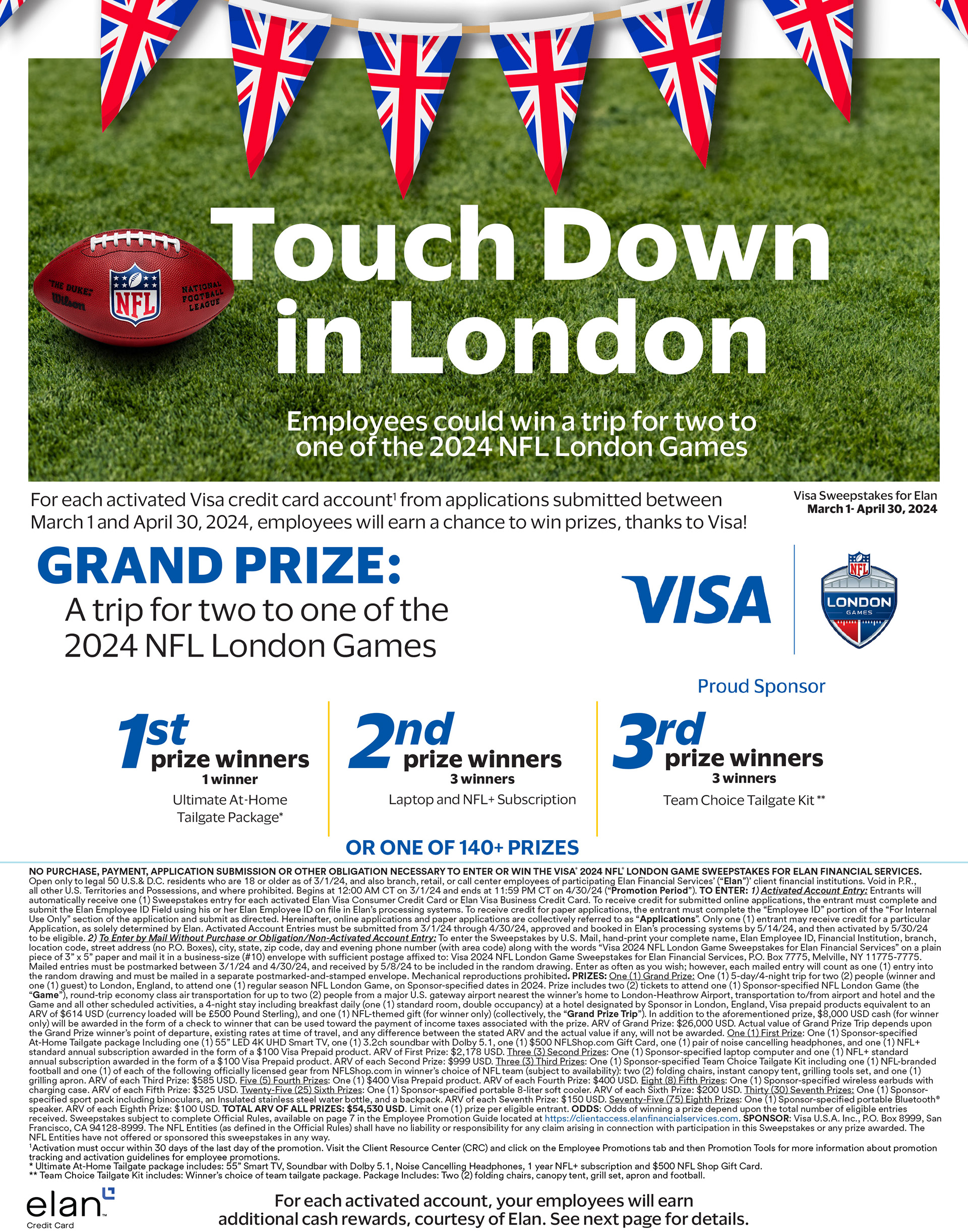 For Elan Financial Services, I developed major collateral for their quarterly sweepstakes program. Each campaign began with multiple concepts tailored to the featured prize, which were then adapted across employee-facing documents, collateral, and banners. These projects required navigating tight timelines, strict brand guidelines, and complex legal copy requirements.